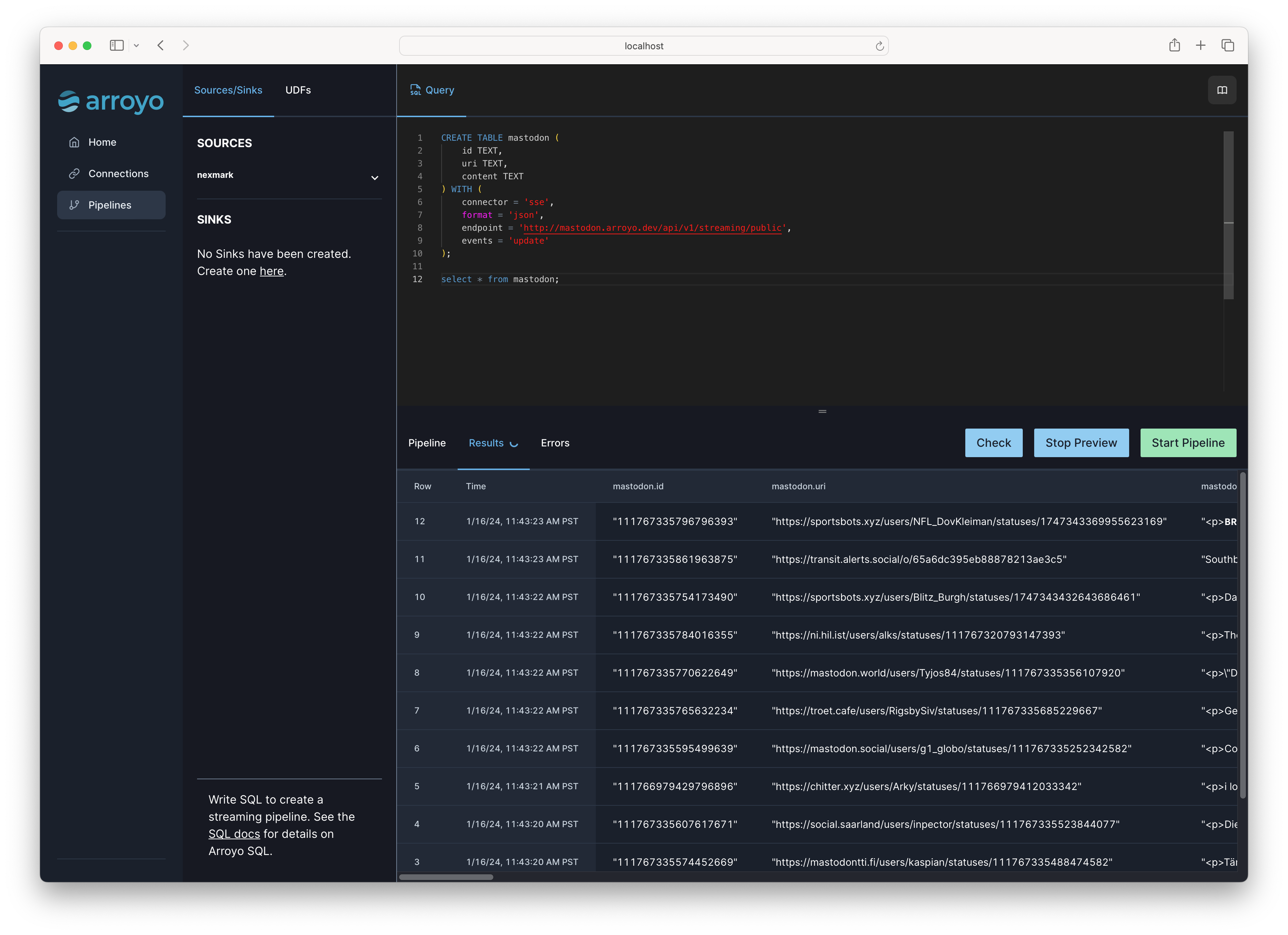 CREATE TABLE mastodon ( id TEXT, uri TEXT, content TEXT) WITH ( connector = 'sse', format = 'json', endpoint = 'http://mastodon.arroyo.dev/api/v1/streaming/public', events = 'update');Then we can read from it, to get a sense of the data: